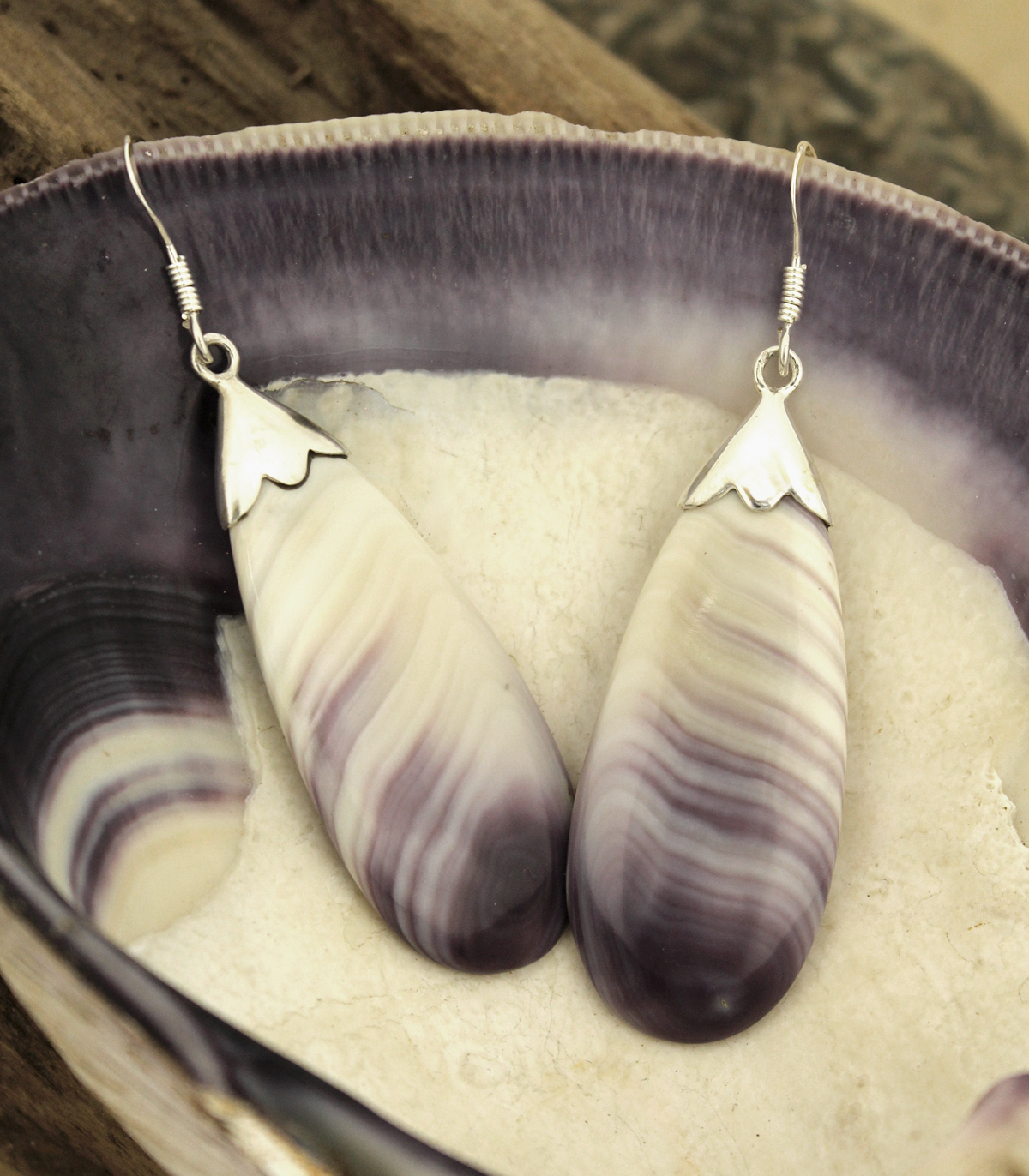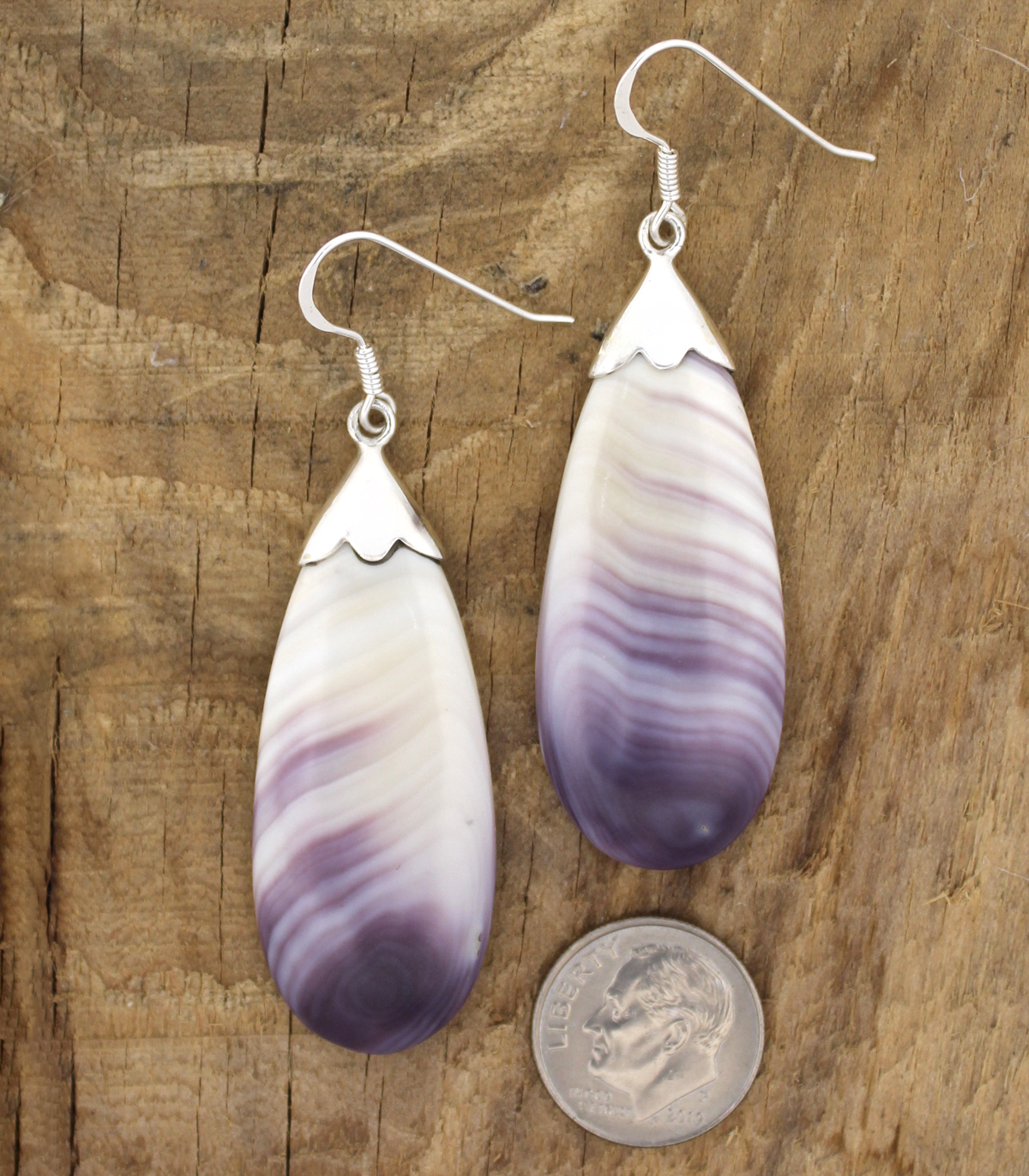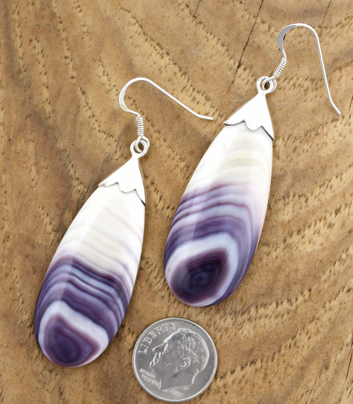 These impressive large drop shaped Wampum earrings come on a sterling silver cap with hooks. They measure approximately 2 inches in length and 3/4 inches at the widest. Overall (including hooks) 2 1/2 inches in length.