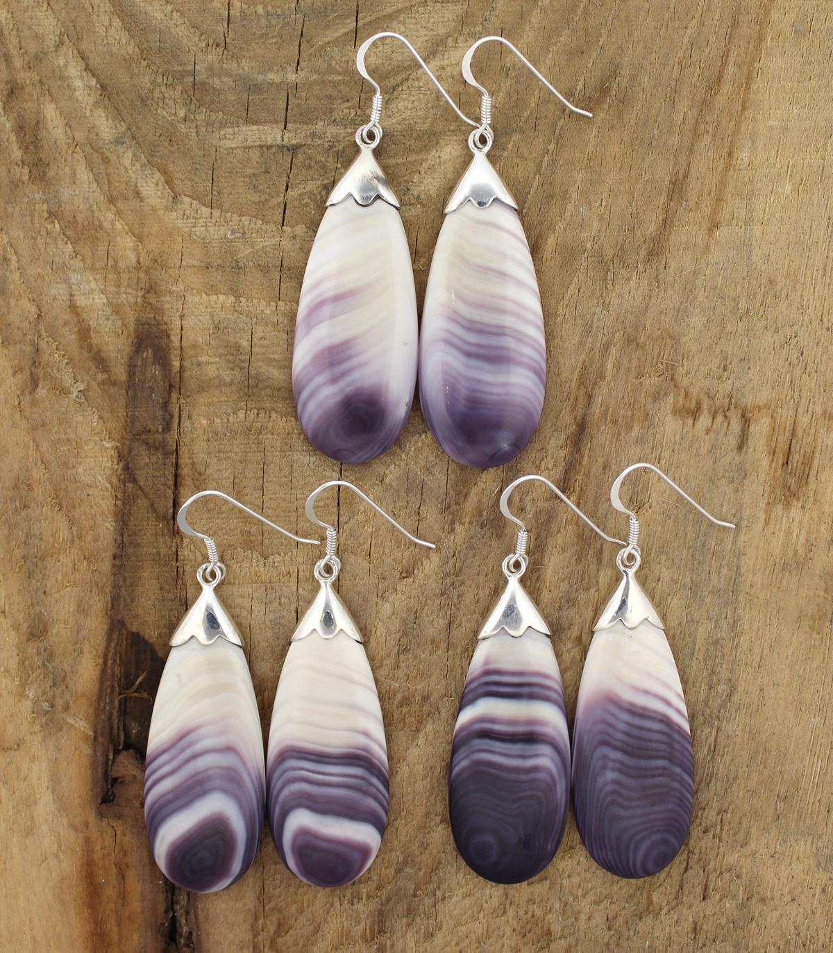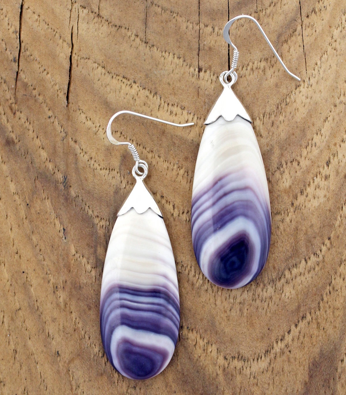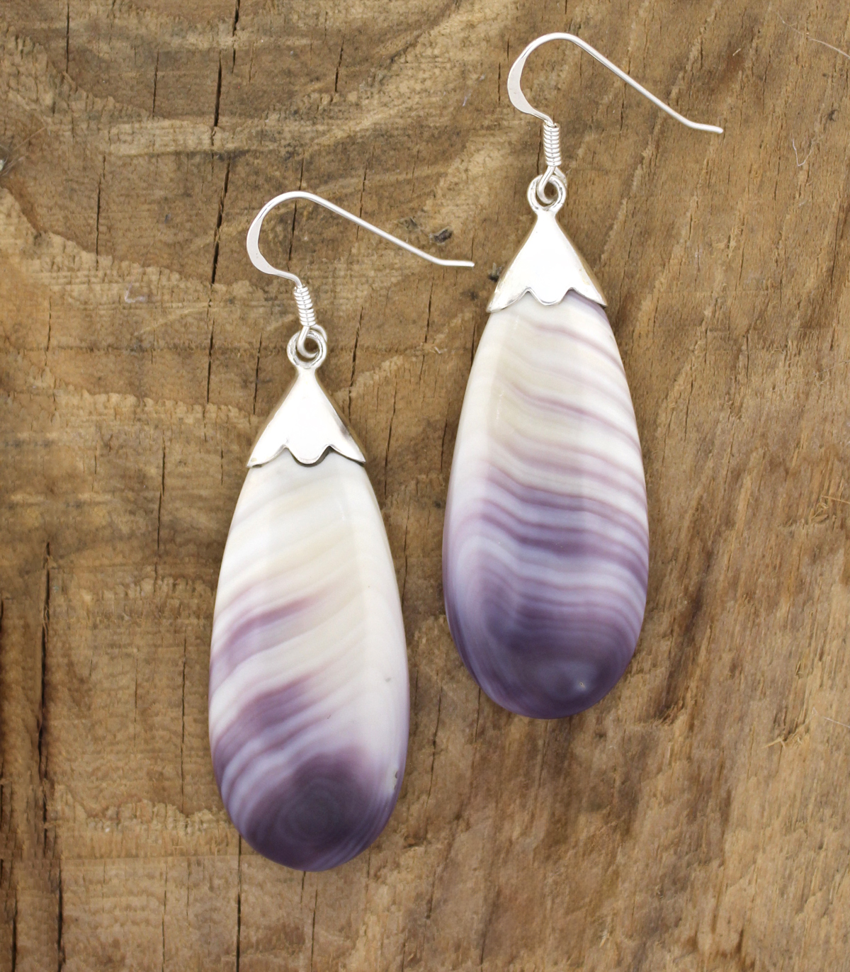 These impressive large drop shaped Wampum earrings come on a sterling silver cap with hooks. They measure approximately 2 inches in length and 3/4 inches at the widest. Overall (including hooks) 2 1/2 inches in length.