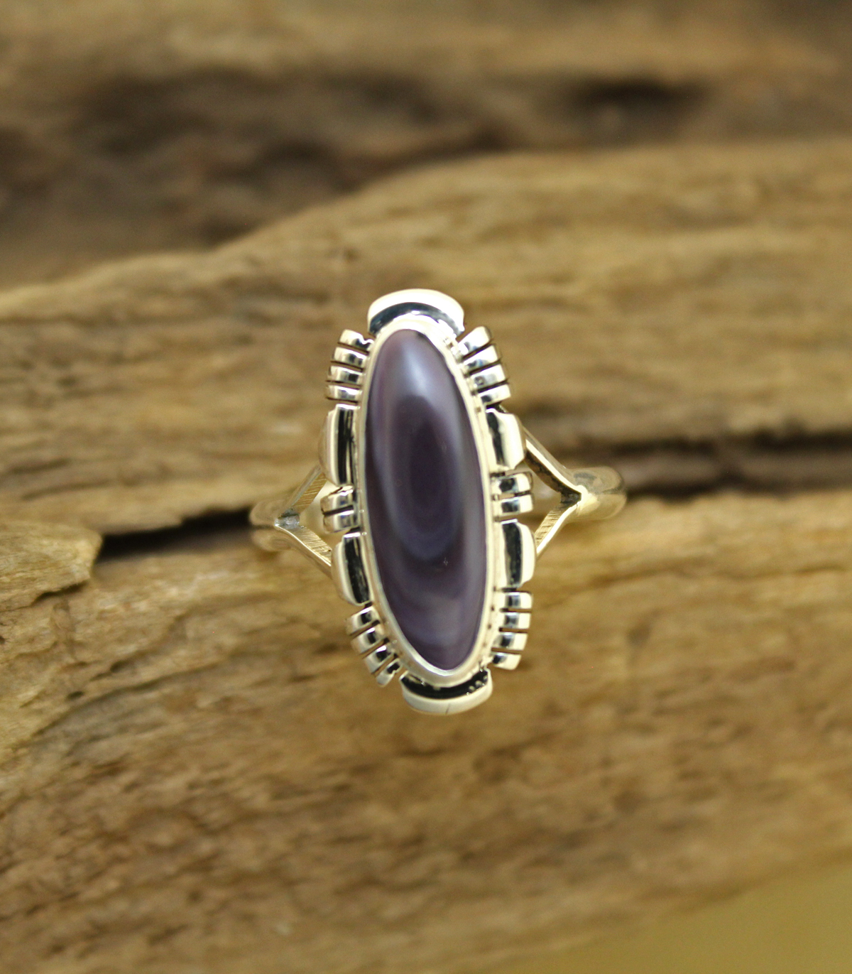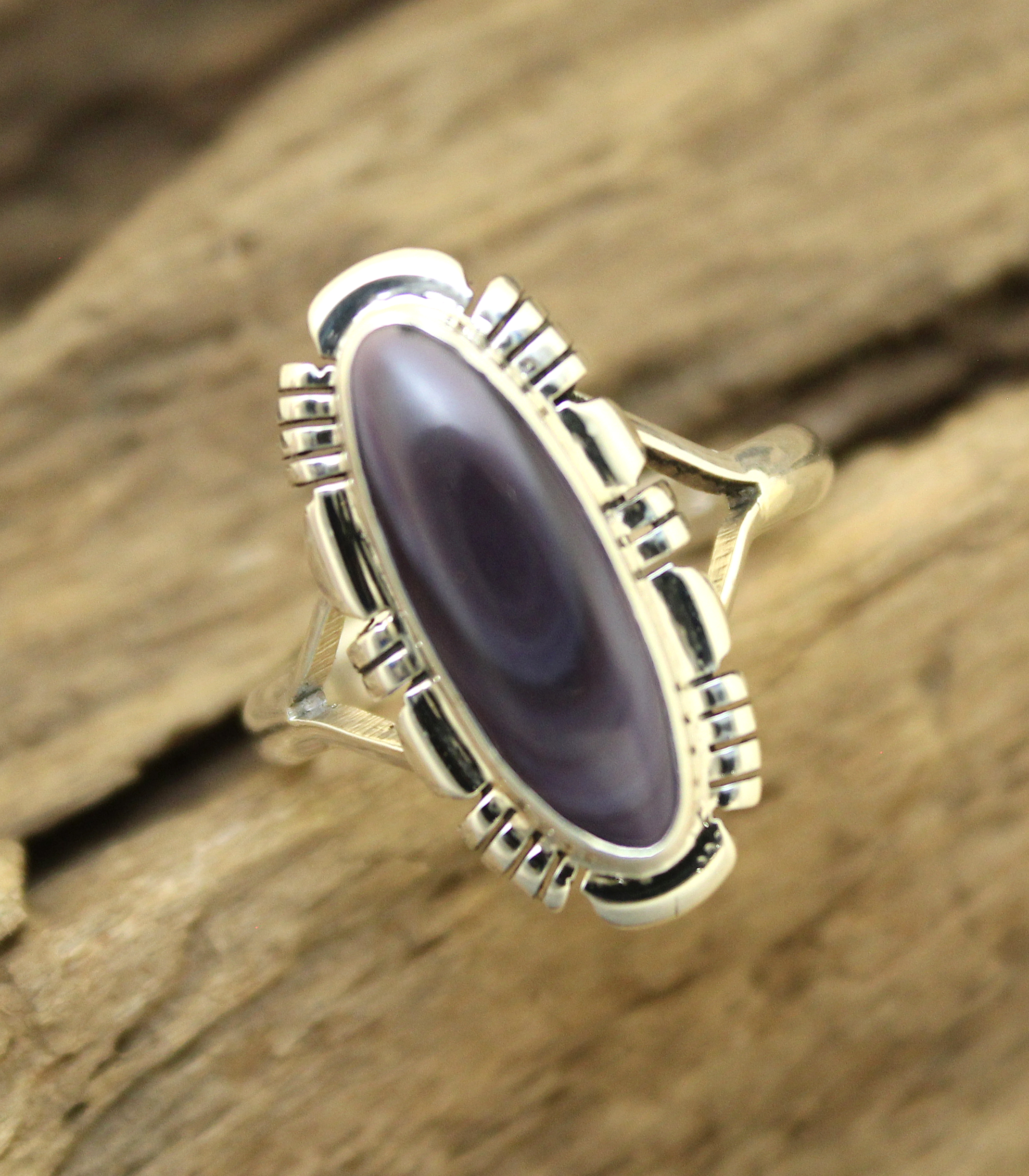 This cute ring is handcrafted in our workshop with Sterling Silver and features a medium size long-oval Wampum cabochon. Surrounded with a beautiful cut half-round edge.