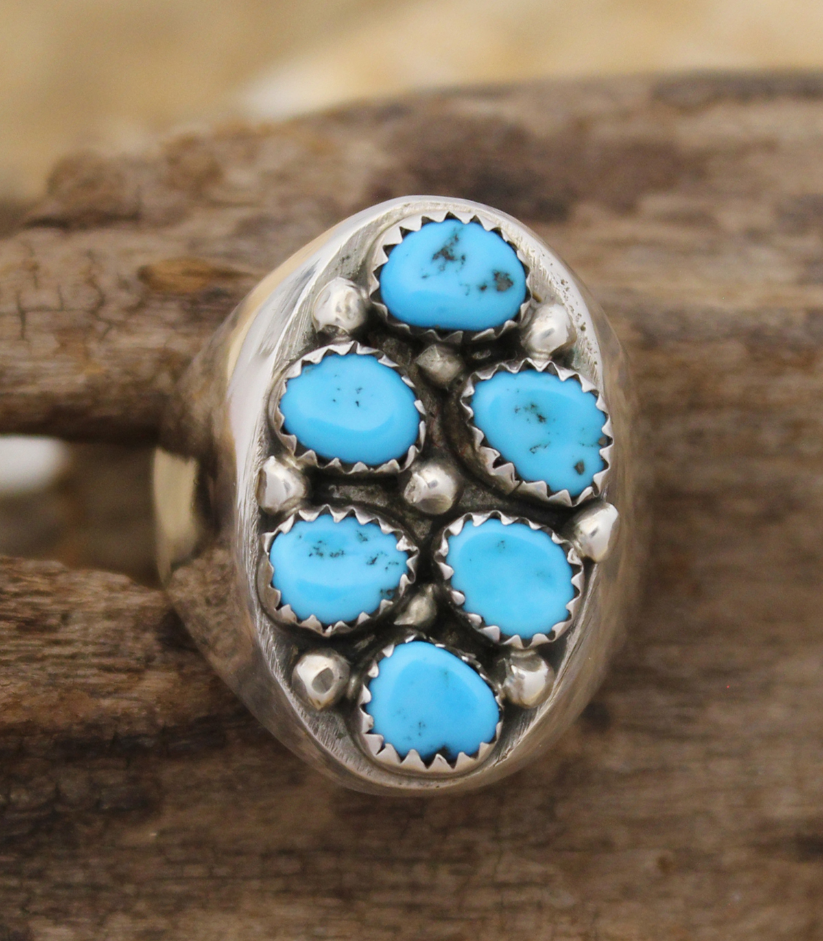 Heavy simple Sterling Silver shank with multiple small Kingman turquoise cabs. Available for different finger sizes. Native American Made ring. Stylish turquoise with just the right amount of sterling silver. Dont miss out on these unique rings. Leave your size in the comment box at checkout.