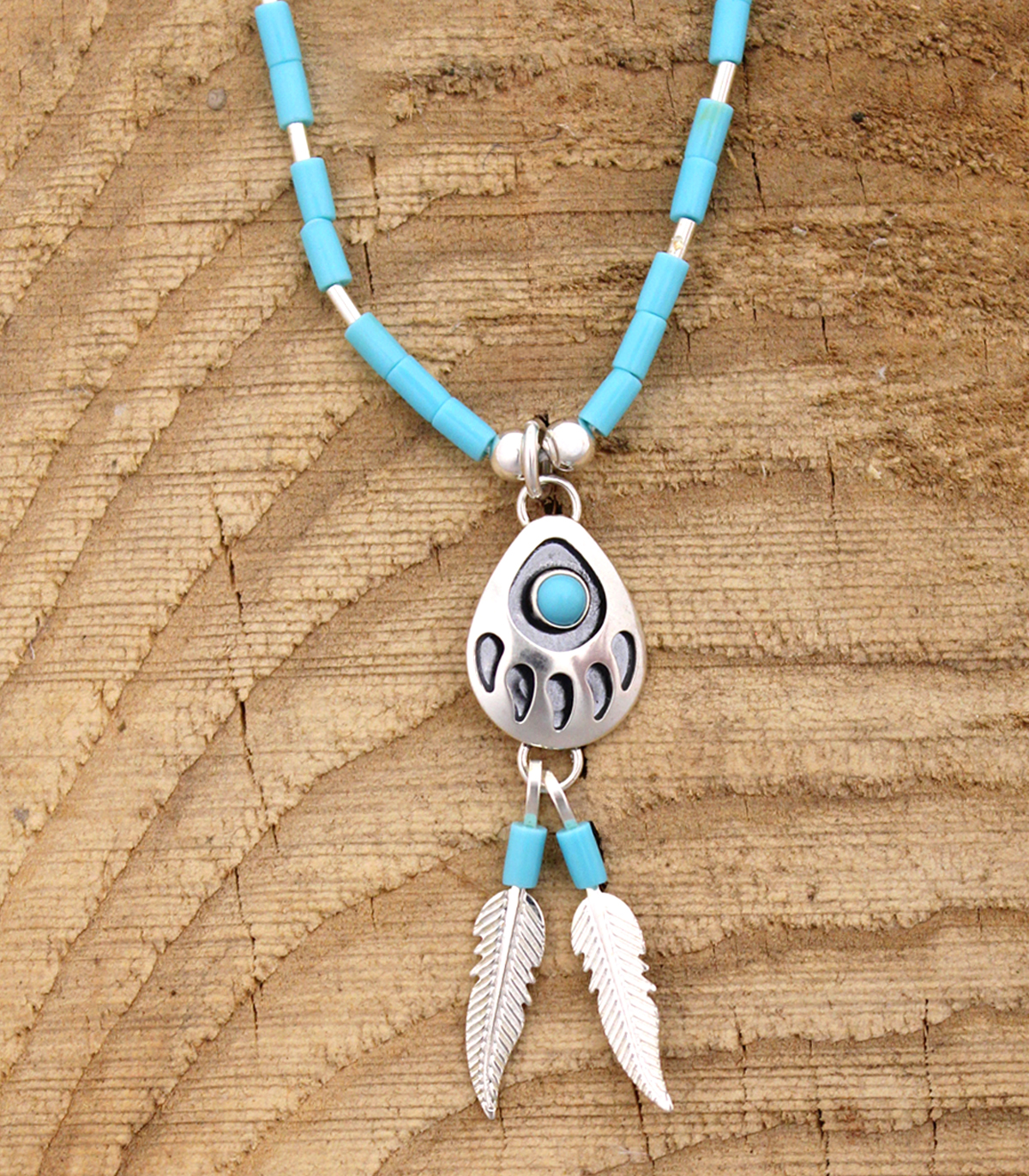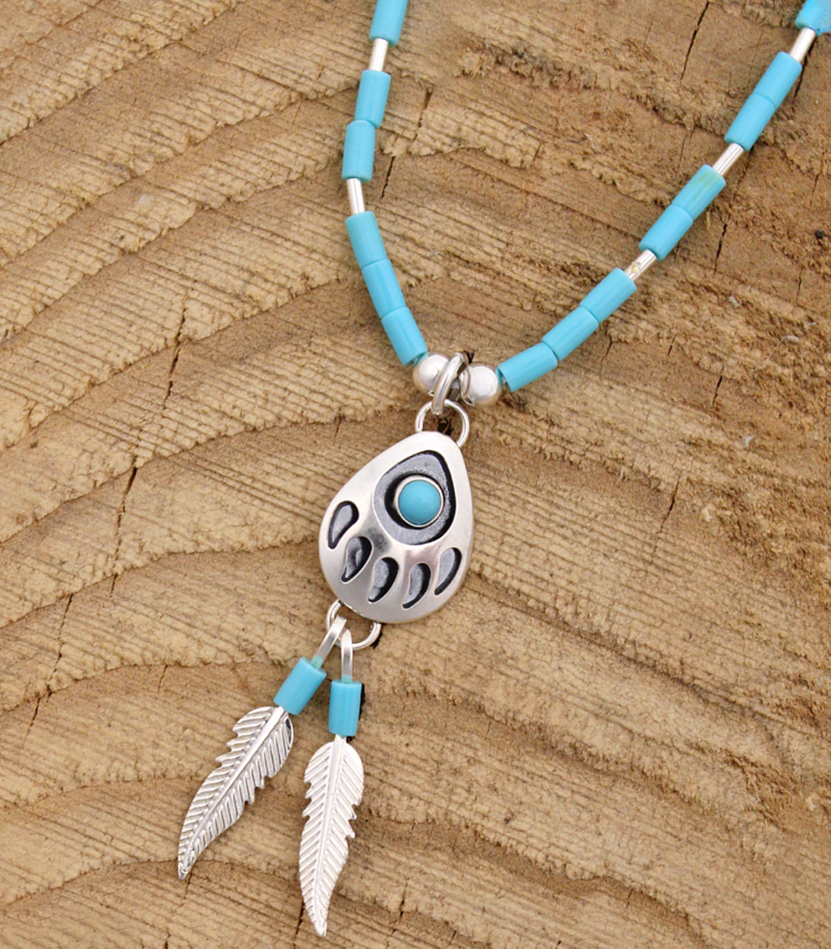 A cute bear paw pendant with two feathers are on a liquid silver chain with additional tiny turquoise tube beads. Different lengths available upon request (leave a note at check out).