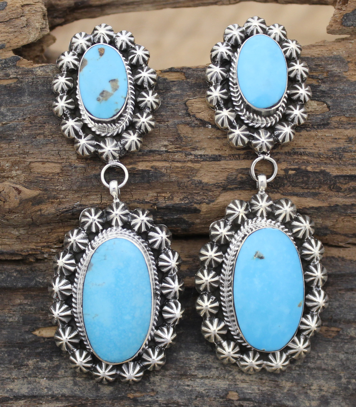 For Individuals who want to feel the weight of their eye-catching turquoise earrings. The large oval Kingman turquoise in the center is surrounded by star-flower-like silver design. Wear it for this special occasion on a night out or to upscale your day-outfit.