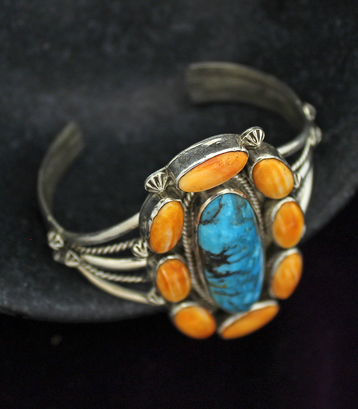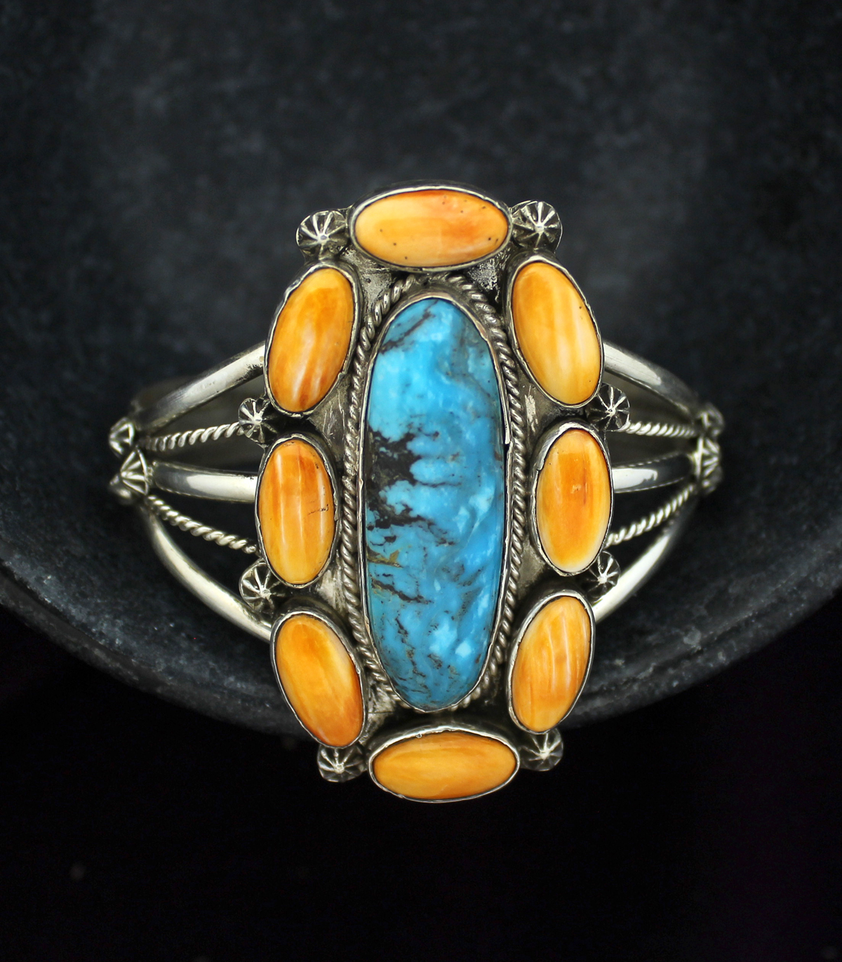 Large Kingman turquoise surrounded by small oval spiny oyster cabochons. Made for TRADITIONAL HANDS by our very good friend Delbert Begay.