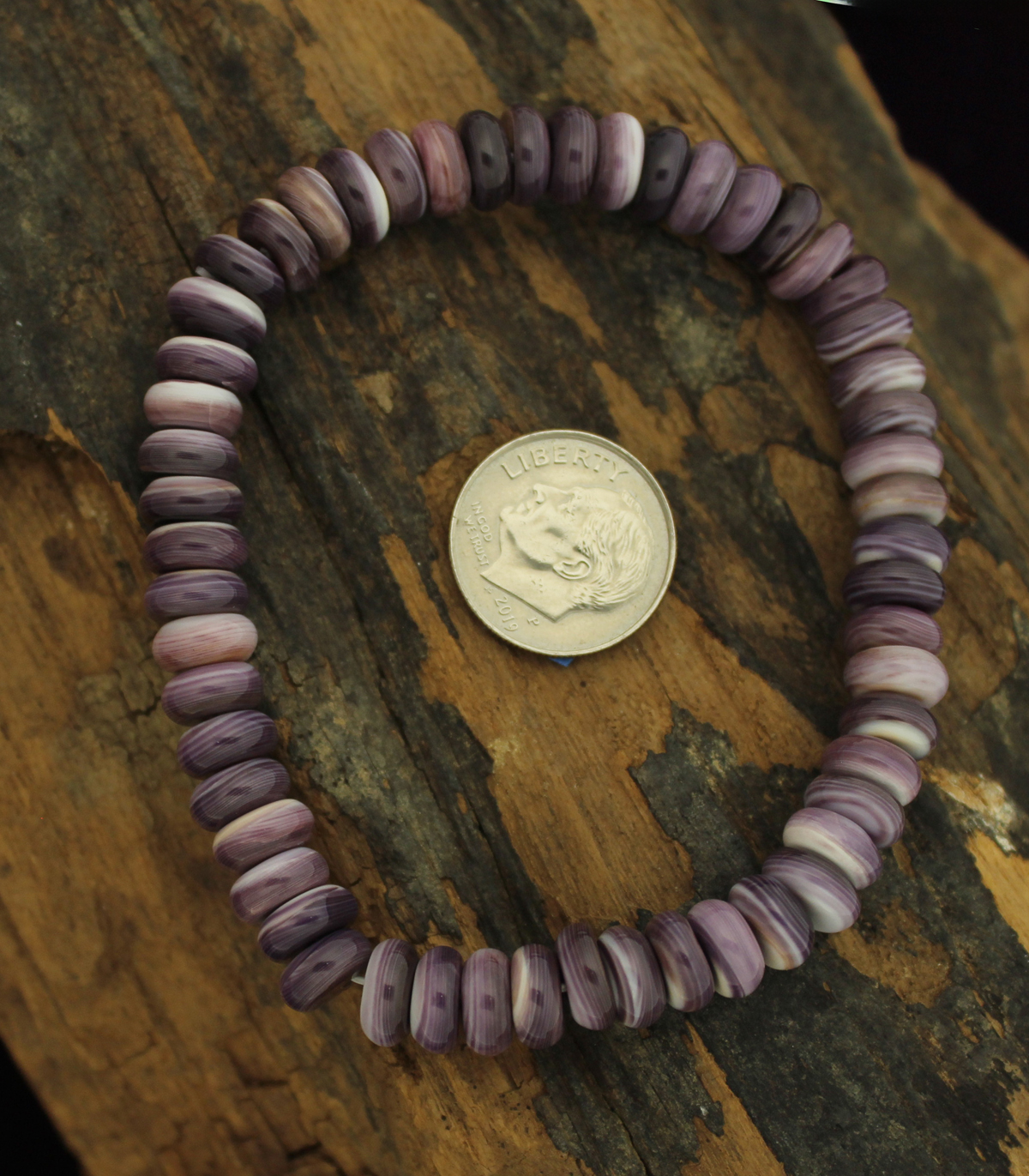 Medium small Wampum rondell beads (approximatly 7-8mm diameter) on a very sturdy stretch band makes this bracelet easy to wear on any medium to medium/large wrist. Color and thickness of natural Wampum beads can vary, as shown on the picture. Price is per one bracelet.
