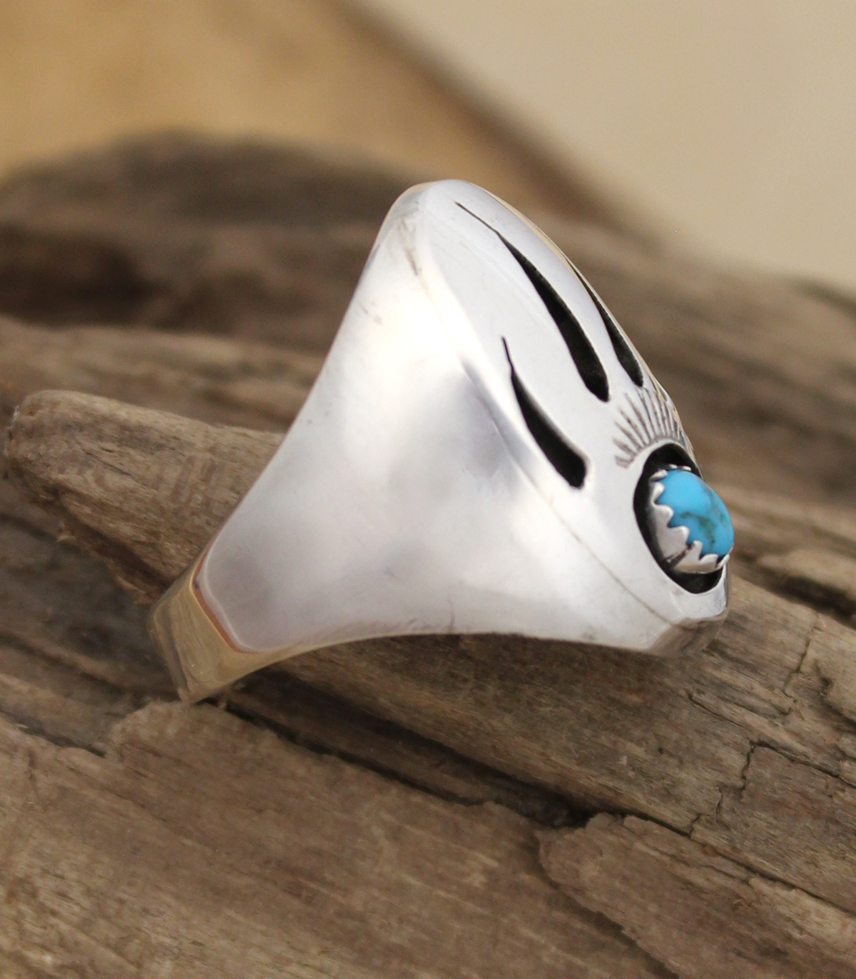 A large bear paw shadowbox ring for a larger hand. This ring features a small turquoise nugget as an accent for the cut-out bear paw design. Leave us a note in the comment box for the size you need.