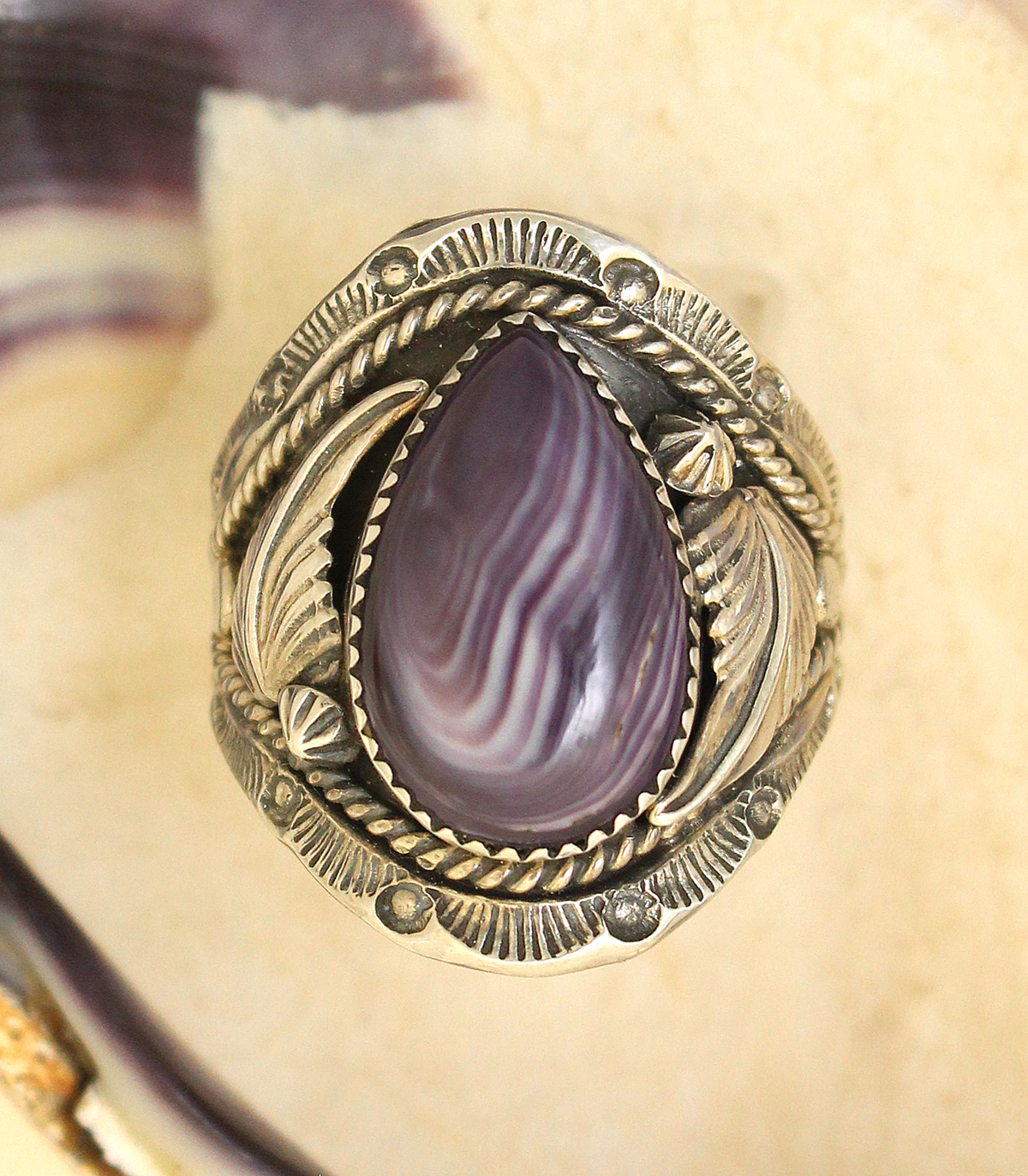 Elaborate Sterling Silver decor surrounding a large teardrop shaped Wampum cabochon. The wide shank supports a great fit come Winter or Summer. Made exclusively for TRADITIONAL HANDS by Navajo Artist Delbert Begay. Tarnished Sterling Silver setting for an 'antique style'.