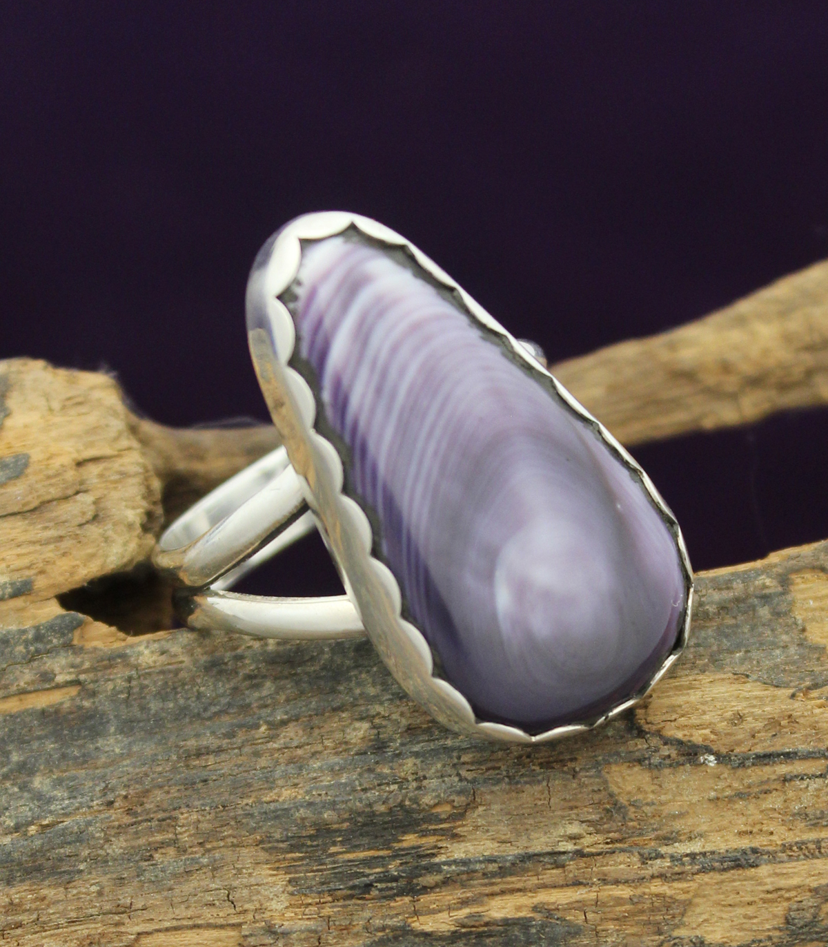 Freeform Wampum Cabochon in simple scalloped Sterling Silver setting.