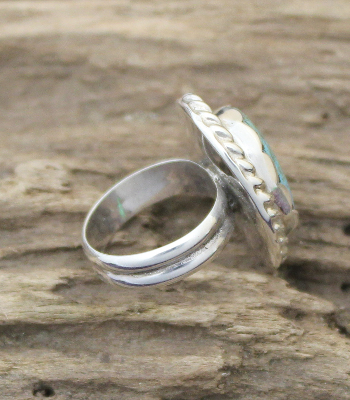 A small handcut Persian turquoise set in a scalloped Sterling Silver bezel and twisted rope design. For any gender, this ring can also be worn as a nice pinky ring. Leave a note with your desired ring size in the Comment box.